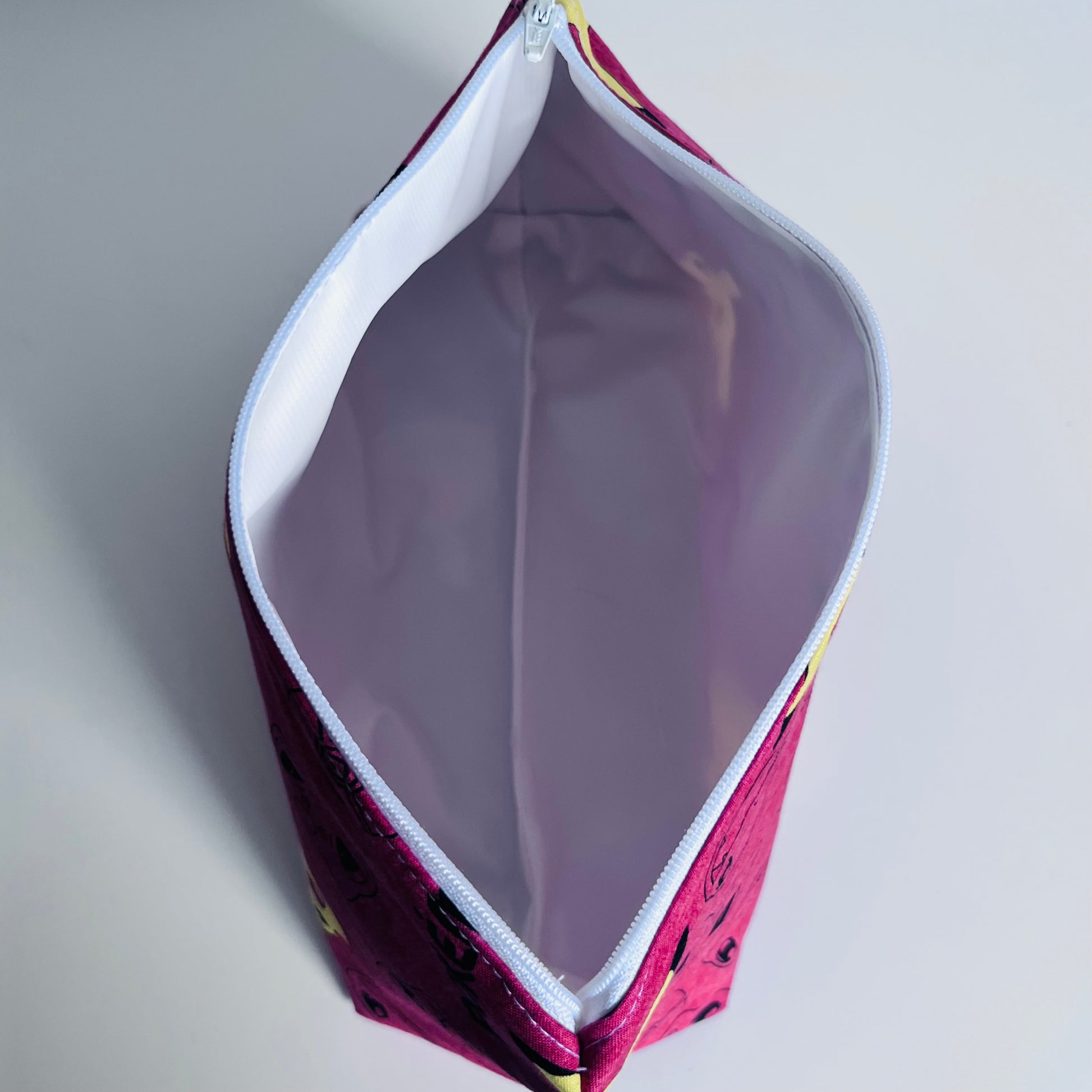 A classic zipper bag with a waterproof lining for many different uses. The lining is very easy to wipe clean of messes and is of the highest quality food safe standard. This bag has lots of room for make up, hair care products , makers, electronics, diapers and so much more.