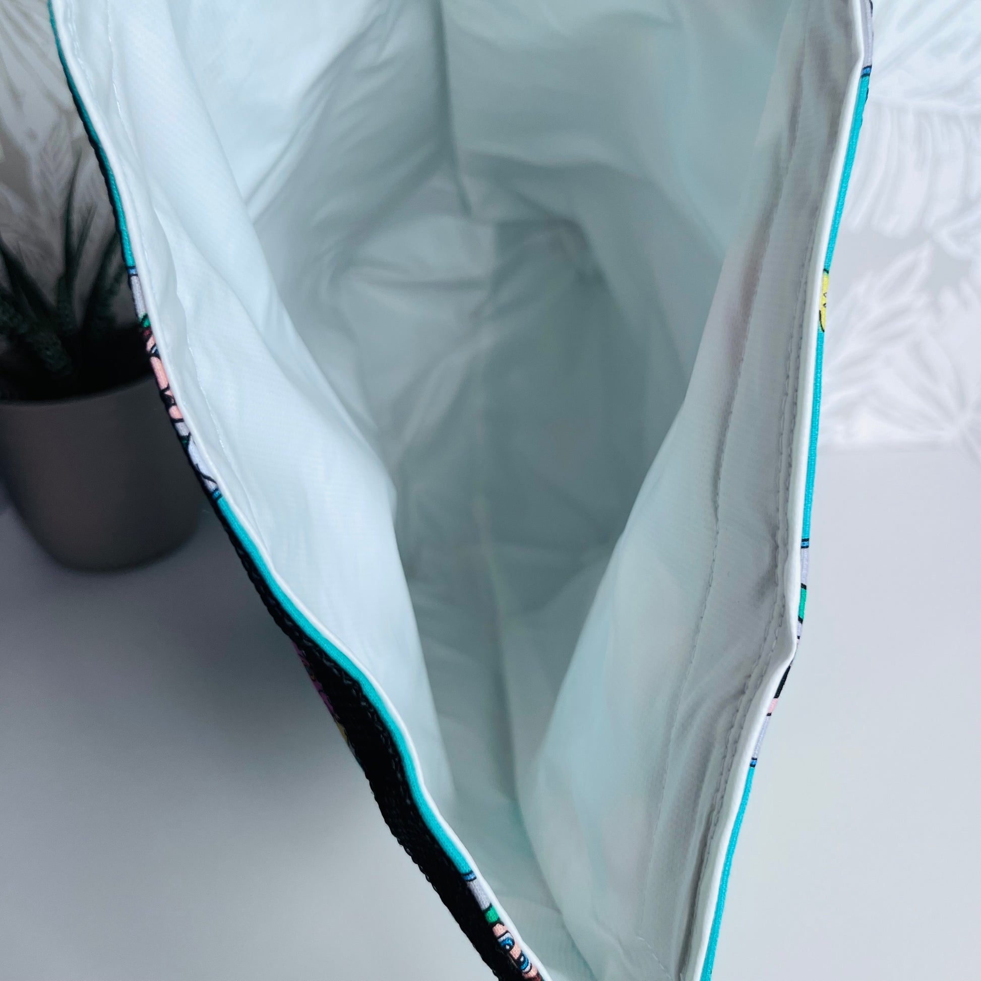 Bags are made with a waterproof food safe PUL fabric lining, 100% cotton exterior, thermal insulation, webbing and a plastic clip.