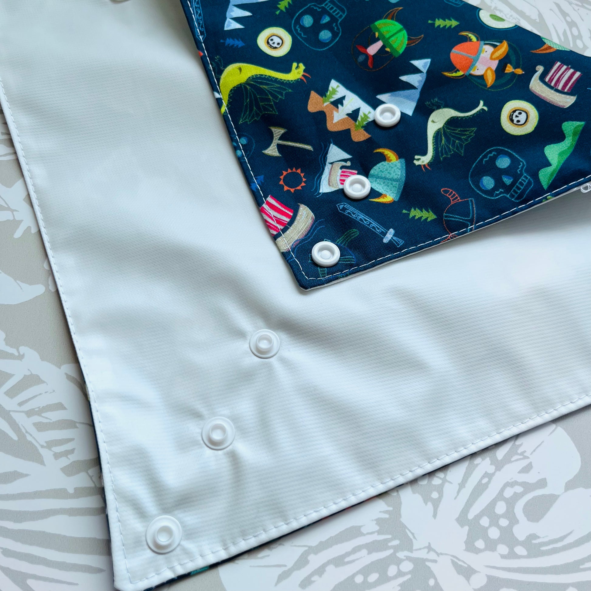 These wraps are made with 100% cotton, a food safe waterproof PUL fabric and plastic snaps