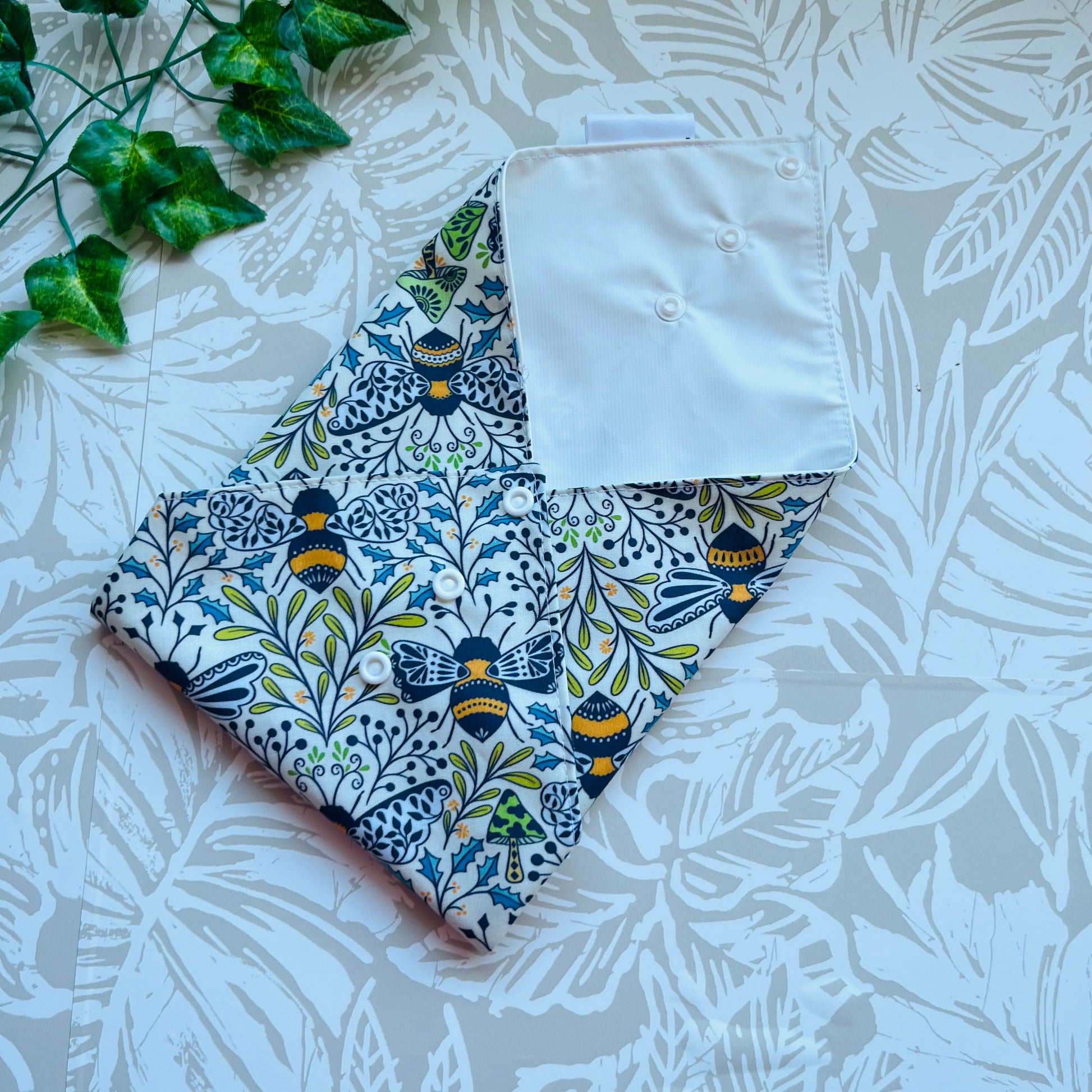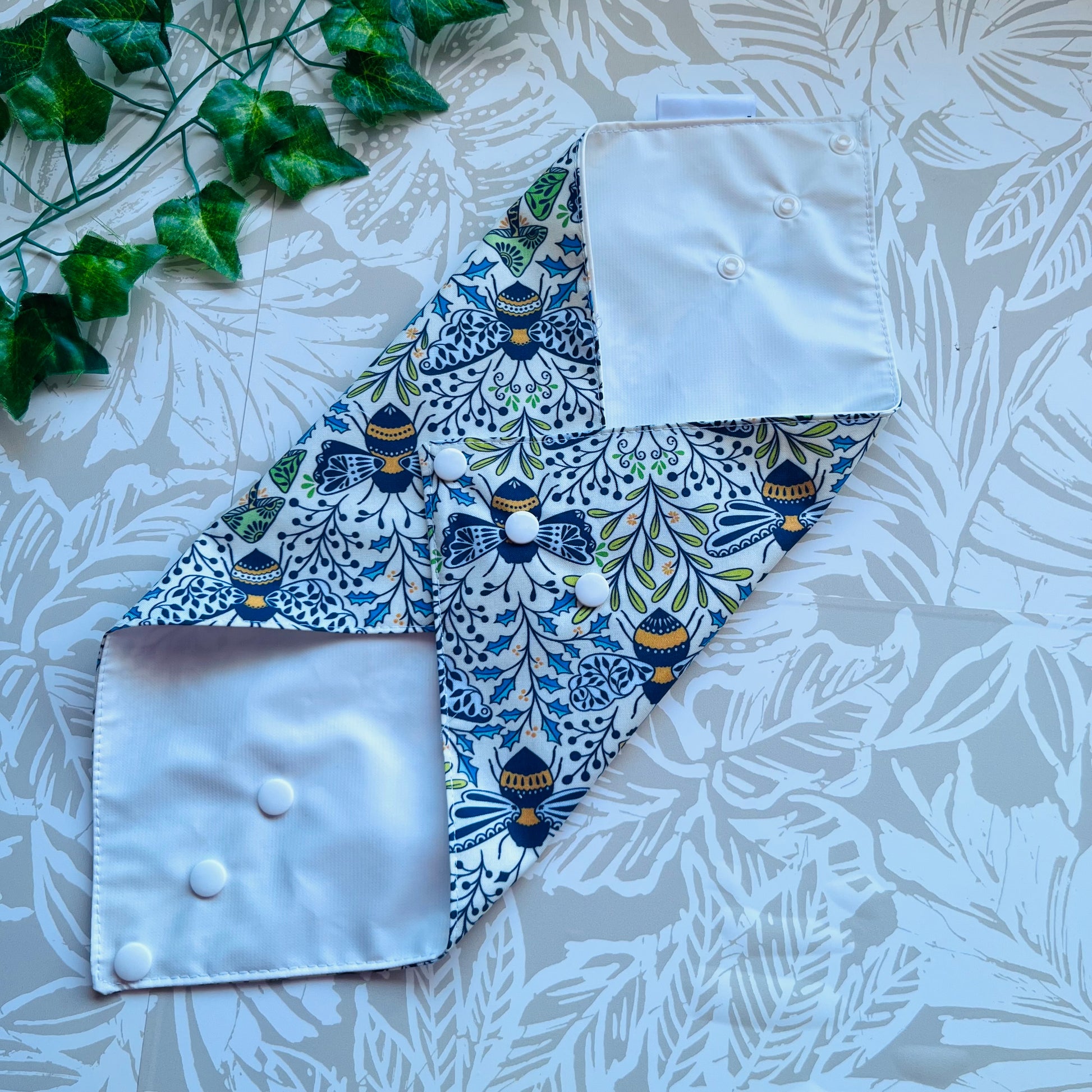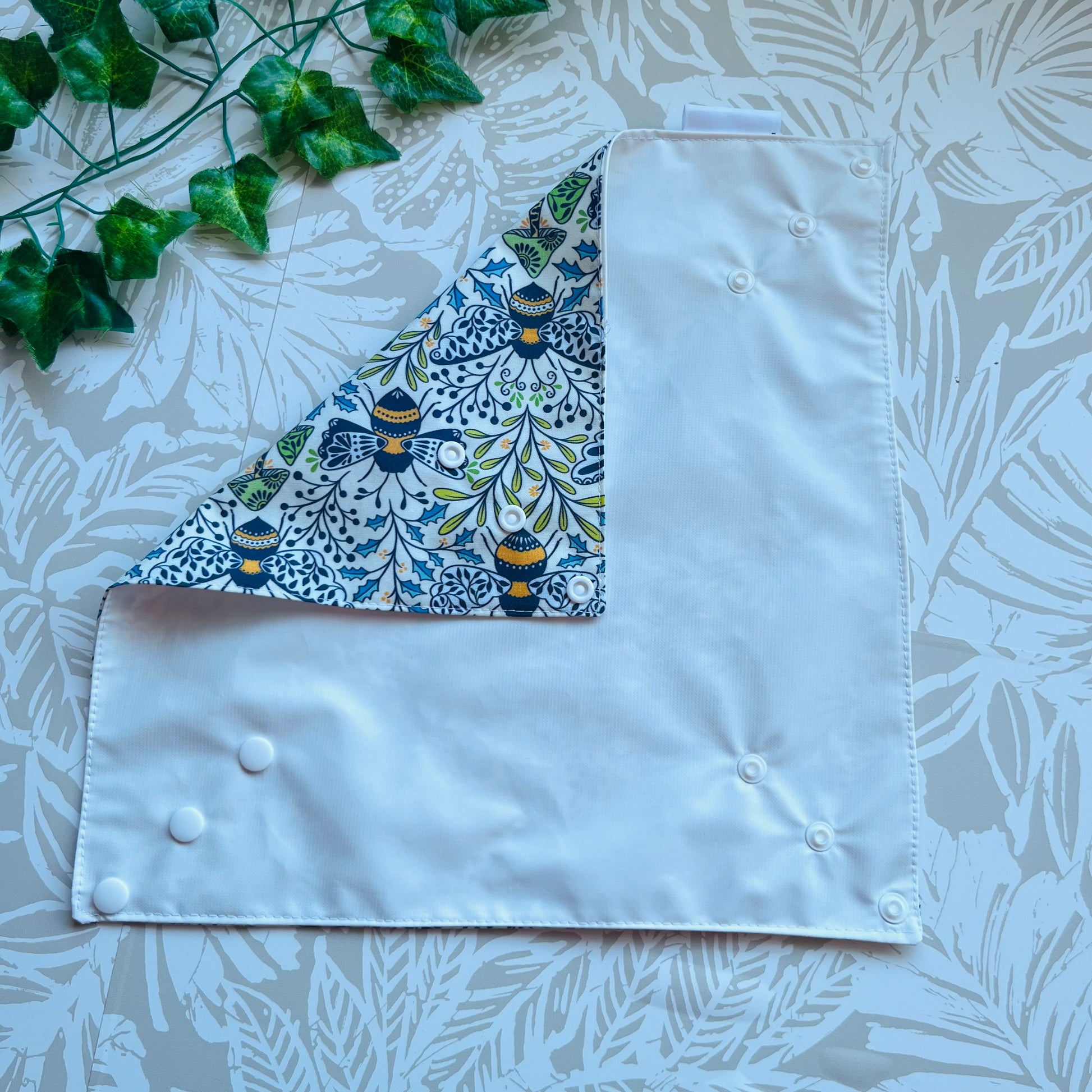These wraps are made with 100% cotton, a food safe waterproof PUL fabric and plastic snaps