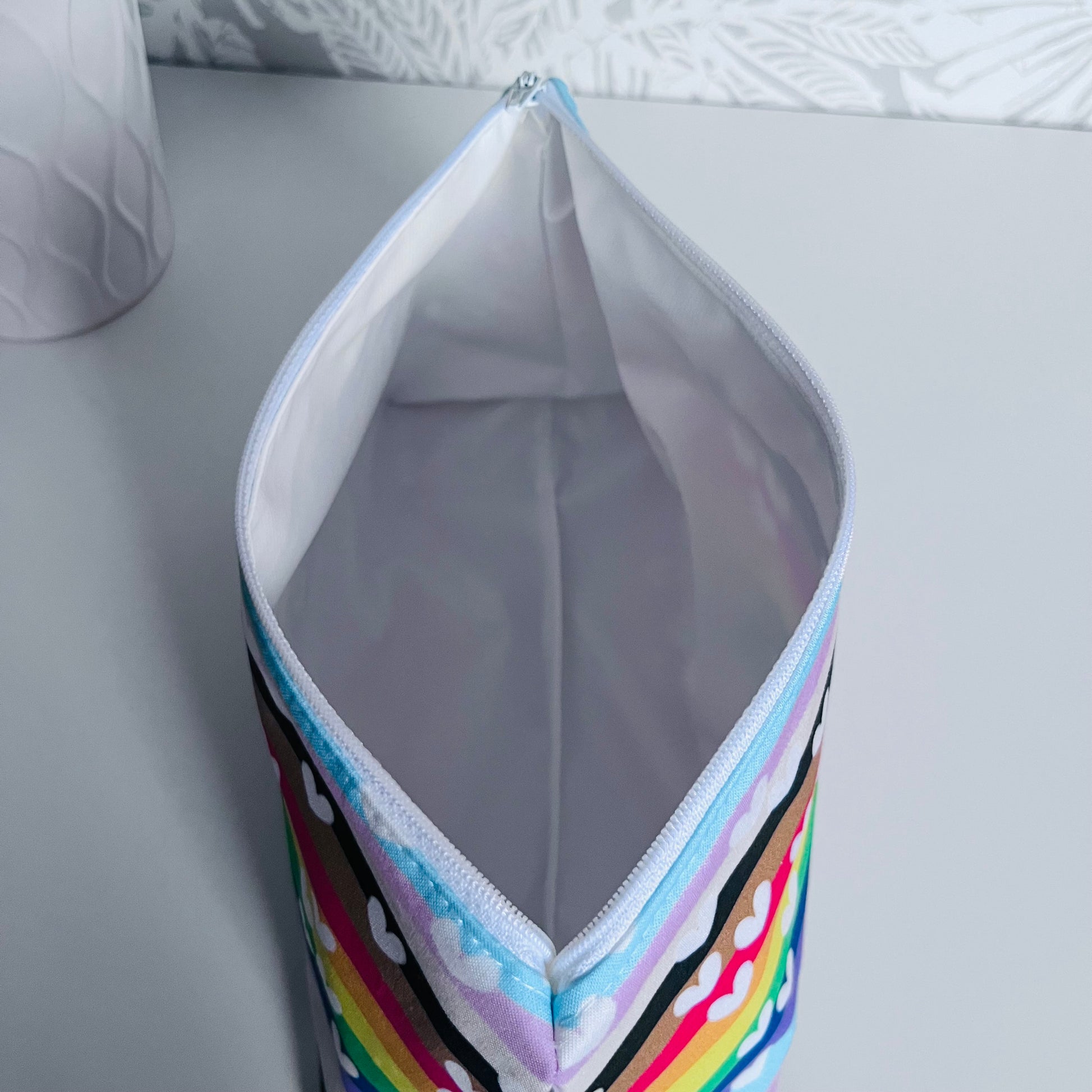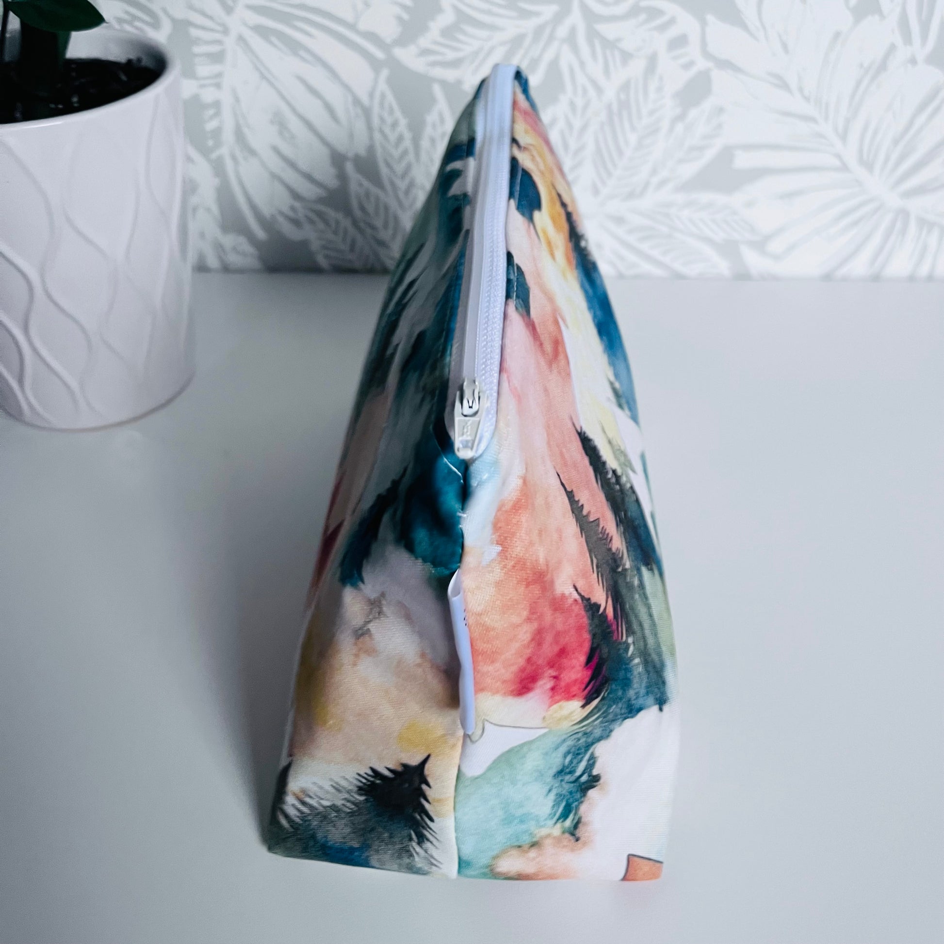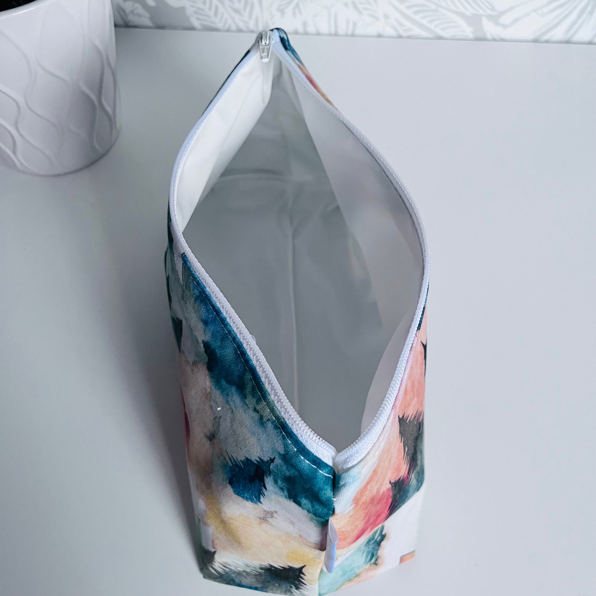 A classic zipper bag with a waterproof lining for many different uses. The lining is very easy to wipe clean of messes and is of the highest quality food safe standard. This bag has lots of room for make up, hair care products , makers, electronics, diapers and so much more.