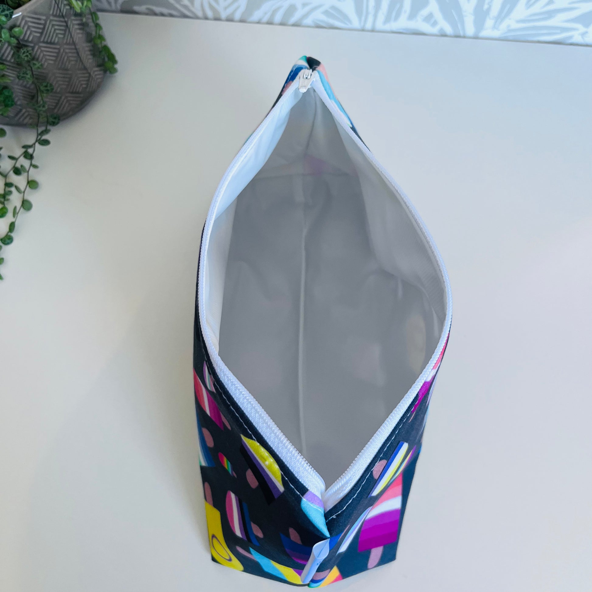 A classic zipper bag with a waterproof lining for many different uses. The lining is very easy to wipe clean of messes and is of the highest quality food safe standard. This bag has lots of room for make up, hair care products , makers, electronics, diapers and so much more.