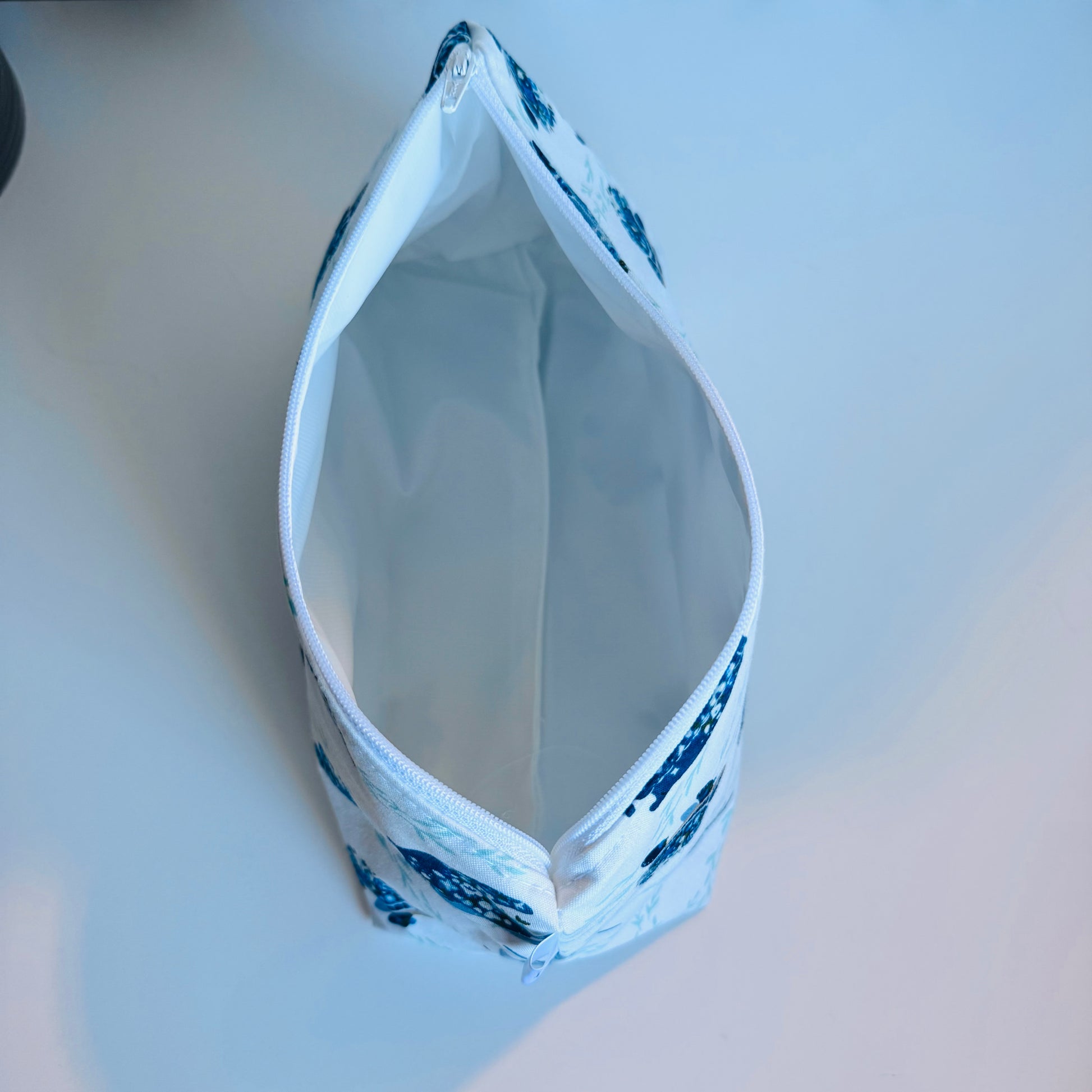 A classic zipper bag with a waterproof lining for many different uses. The lining is very easy to wipe clean of messes and is of the highest quality food safe standard. This bag has lots of room for make up, hair care products , makers, electronics, diapers and so much more.